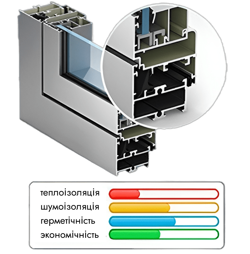 Можливість використовувати товсті склопакети до 56 мм для збереження тепла. Для фасадів можна використати і 100 мм. Теплове розширення вчетверо менше, ніж у пластику