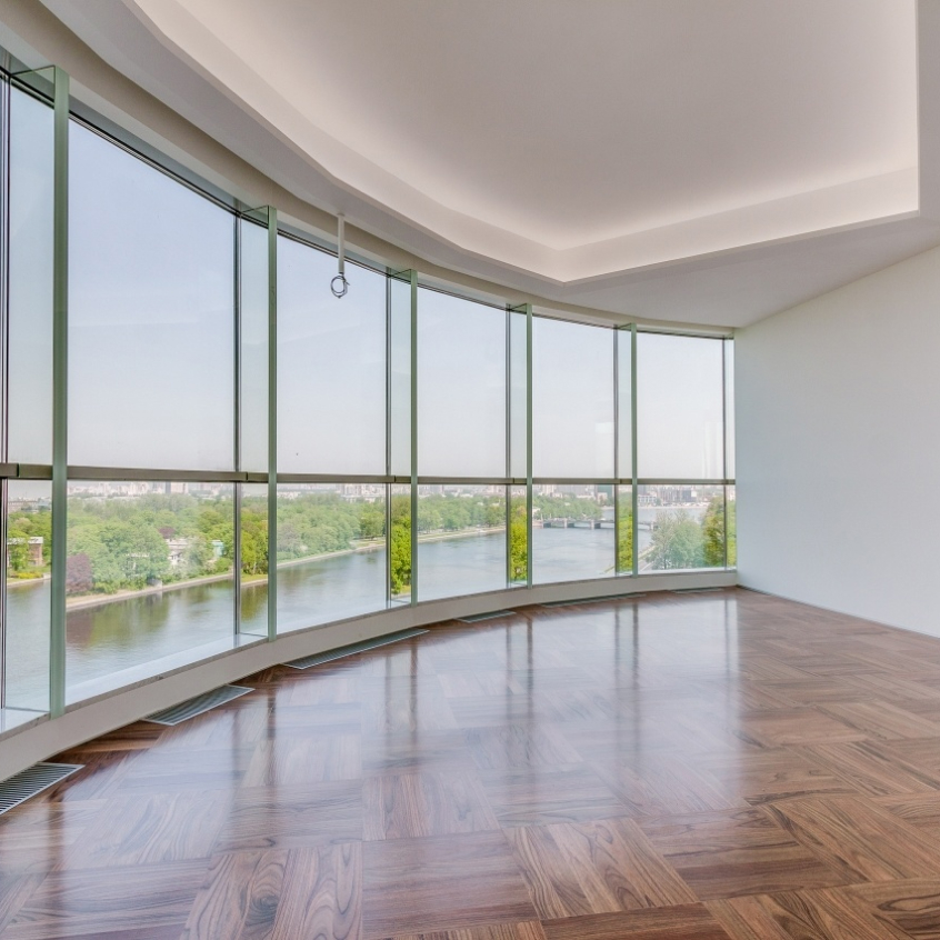 Висота віконних конструкцій цільною стулкою 2700 мм. Загартоване скло товщиною 6 мм без кольору